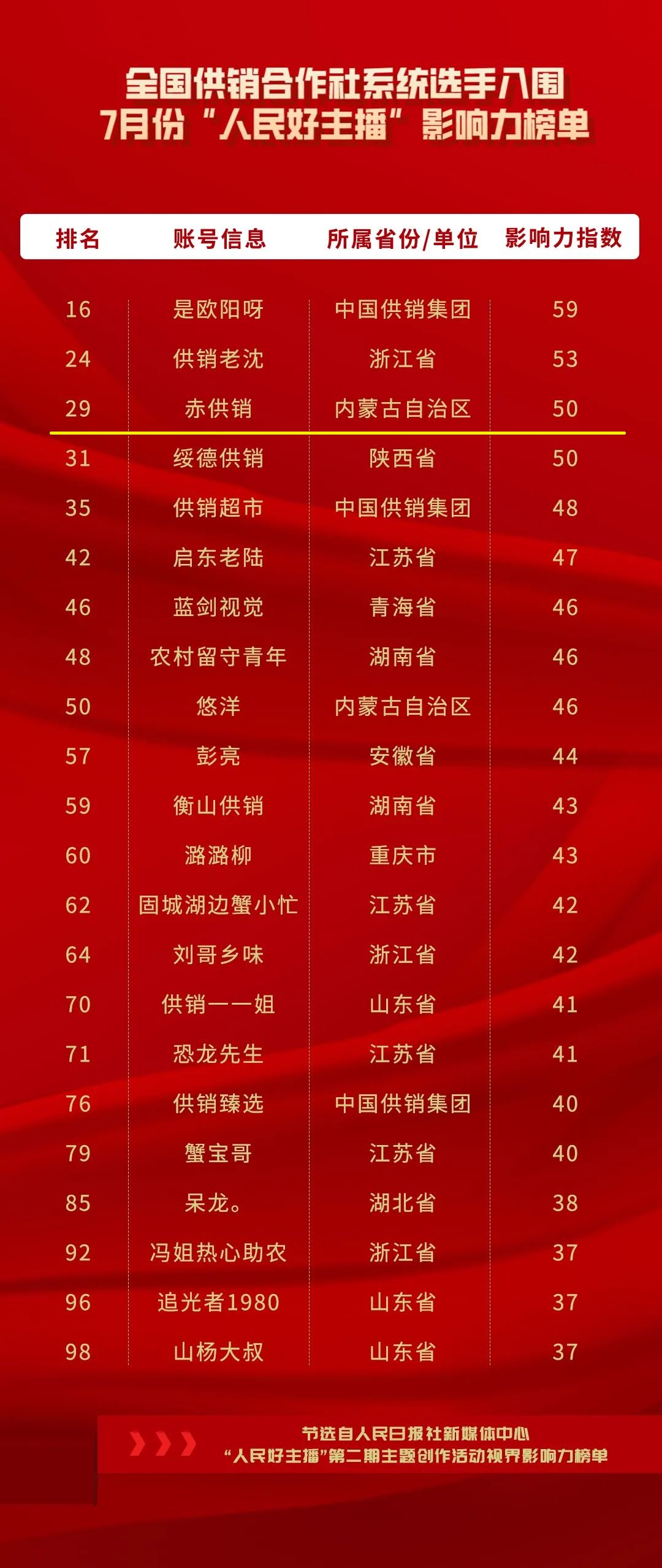 活动开展以来,市供销合作社积极推荐系统内主播参与参加。经过严格审核,市供销合作社社办企业主播账“赤供销”,进入正式比赛赛道。在7月开展的“人民好主播”第二期主题创作活动中,市供销合作社社办企业主播账号“赤供销”跻身影响力前100位“人民好主播”榜单(排名29,影响力指数50),充分展示了全市供销合作社系统服务“三农”的优良形象。