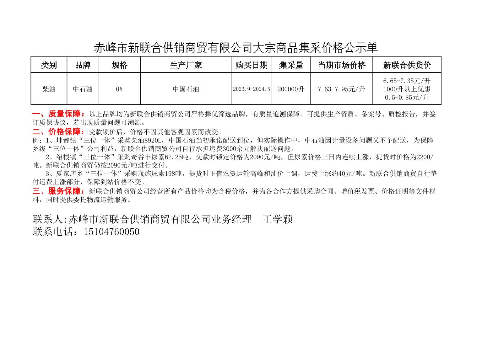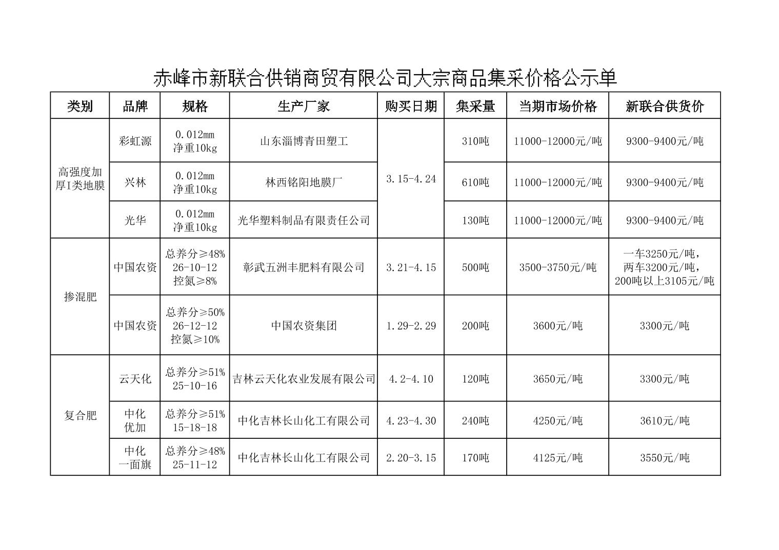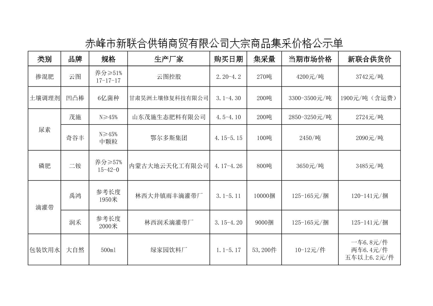 赤峰市新联合供销商贸有限公司大宗商品集采价格公示单