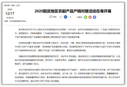 新华网北京12月17日 记者从中华全国供销合作总社获悉,12月16日,由中华全国供销合作总社、广东省人民政府共同主办,财政部协办,中国供销集团、广东省供销合作社、中国供销电子商务有限公司、惠州市人民政府承办的2025脱贫地区农副产品产销对接活动在广东省惠州市粤港澳大湾区绿色农产品生产供应基地开幕。