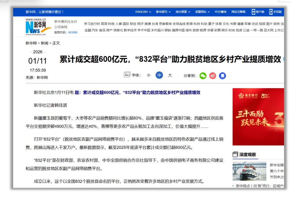 打开“832平台”(脱贫地区农副产品网络销售平台),越来越多来自脱贫地区的特色农副产品通过线上销售,跨越山海进入千家万户。最新数据显示,截至2025年底该平台累计成交额已超600亿元。