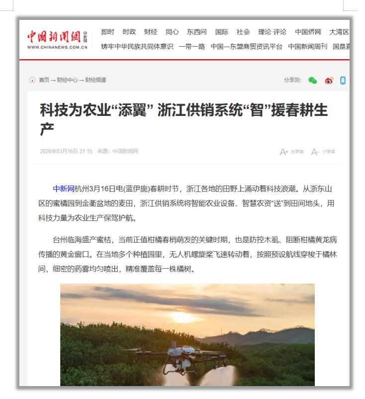 春耕时节,浙江各地的田野上涌动着科技浪潮。从浙东山区的蜜橘园到金衢盆地的麦田,浙江供销系统将智能农业设备、智慧农资“送”到田间地头,用科技力量为农业生产保驾护航。