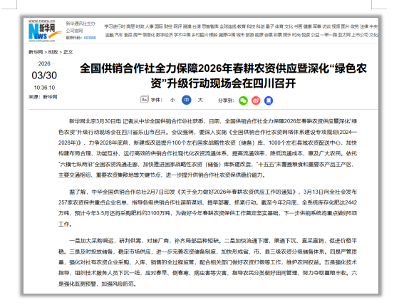 据了解,中华全国供销合作总社2月7日印发《关于全力做好2026年春耕农资供应工作的通知》,3月13日向全社会发布257家农资保供重点企业名单,指导各级供销合作社超前谋划、提早部署、抓紧行动。截至今年2月底,全系统库存化肥达2442万吨,预计今年3-5月还将采购肥料约3100万吨,为做好今年春耕农资保供工作奠定坚实基础,下一步供销系统将重点做好6项工作。